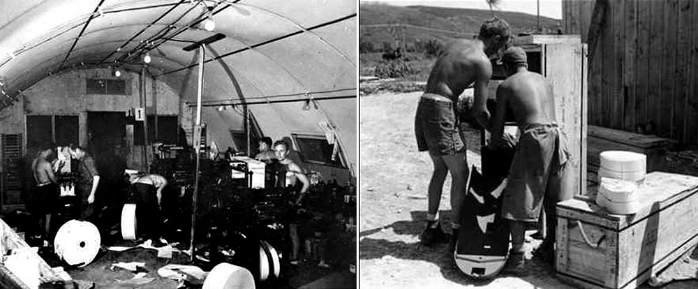 The 17 members of the OWI staff on Saipan were challenged to a previously unmatched degree and by mid-night on 11 August, less than 48 hours after Japan’s surrender acceptance message was received in Washington, three-quarters of a million leaflets giving notification of the surrender had been printed. The fast moving effort included Japanese military POW’s running presses and helping to load the leaflets onto trucks for the Army Air Force to drop from B-29s over Japan.
